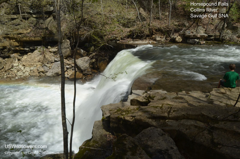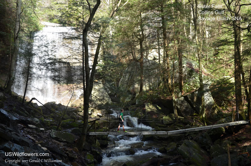 A discussion on Facebook a few days ago reminded me that the Collins Gulf area of Savage Gulch State Natural Area in Grundy County, TN was on my list of areas I wanted to check out for wildflowers. Originally I had targeted it because of reports of Fringed Phacelia (Phacelia fimbriata), but when I photographed that species in the Smokies, Collins Gulf got bumped down a few places on my list. But I wanted to get into a wilderness with my grandson while he was on spring break this week, so I bumped it back up. Checking the weather, Tuesday, April 4, was forecast as the best day, and this time the weatherman was right – rain on Monday gave us good water for the waterfalls, and a beautiful, sunny day showed up Tuesday morning – as forecast. Grandson Joseph and I headed out about 9 AM for the 50-mile drive to the Collins Gulf West Trailhead of Savage Gulch, for Waterfalls and Wildflowers (31 species; see the list at the end of the post.)